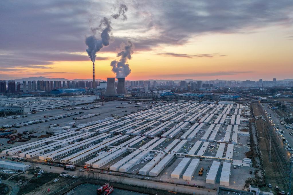 這是3月20日傍晚拍攝的吉林市高新南區(qū)隔離方艙建設(shè)現(xiàn)場(無人機照片)。新華社記者 張楠 攝