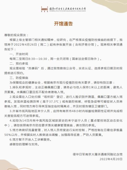 中新網4月20日電 據侵華日軍南京大屠殺遇難同胞紀念館微信公眾號消息,在嚴格落實疫情防控措施的前提下,該館將于2022年4月26日(周二)起有序恢復開放(含利濟巷分館)。