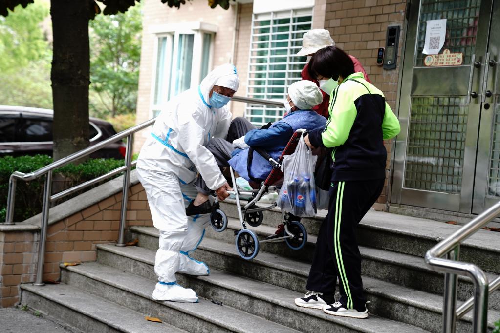 古美社區衛生服務中心司機馮守光協助家屬把血透患者抬下臺階。新華社記者 張建松 攝