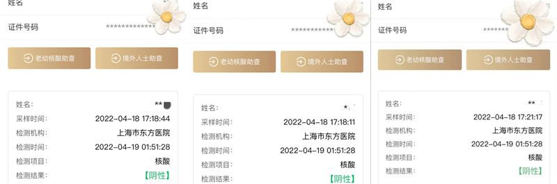 4月18日,在“四葉草”方艙隔離的媽媽已順利返家。4月19日6點(diǎn)多,剛睡醒的我迫不及待的打開核酸檢測查詢,結(jié)果很喜人:我們一家三口齊刷刷地“陰”了。接下來,只要再做一次核酸,大家全“陰”,我們就可以回家了。