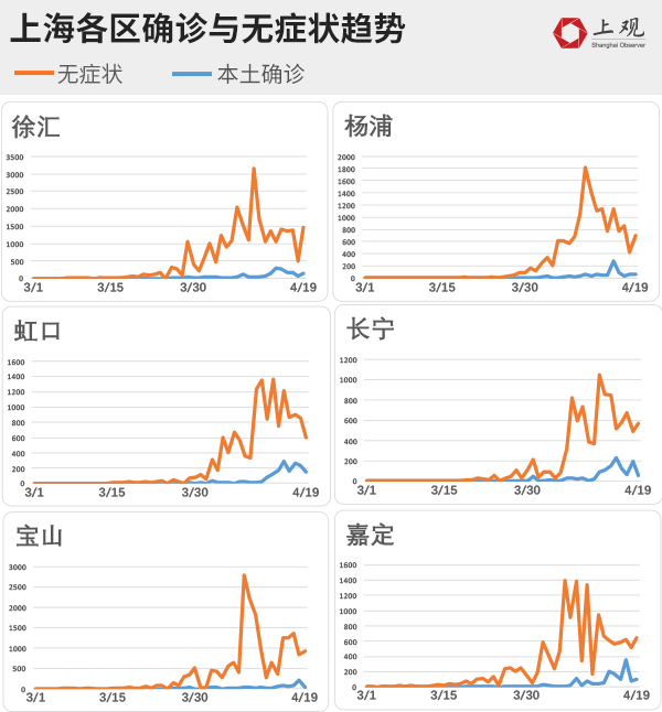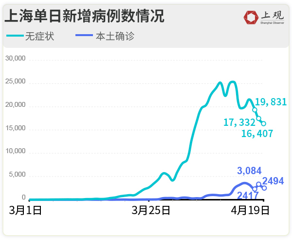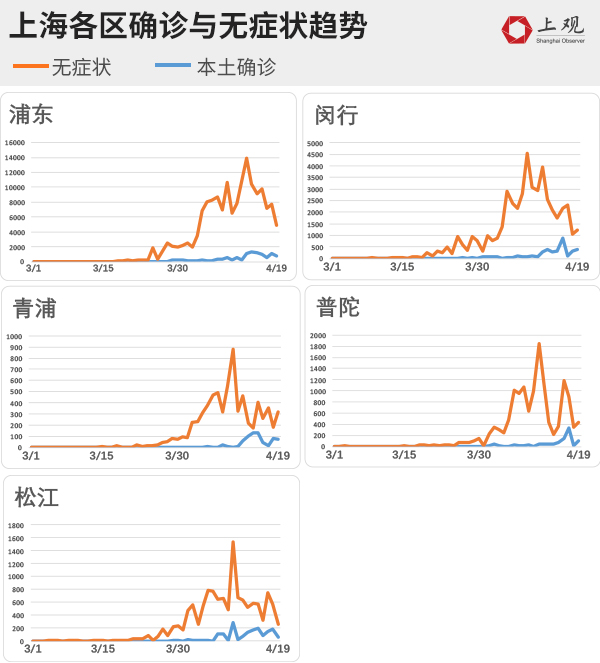 4月13日,浦東單日新增無癥狀感染者數達到峰值,超過1萬3千人。而4月19日,這一數值已降至4926人。