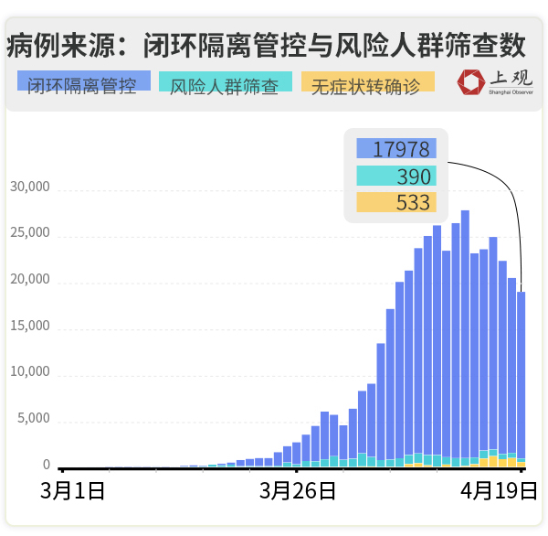 在4月19日新增的18901例患者中(含無癥狀與確診病例),95.12%的患者在閉環隔離管控中被發現,2.06%的患者為風險人群篩查,而2.82%的患者為此前的無癥狀患者轉為確診病例。