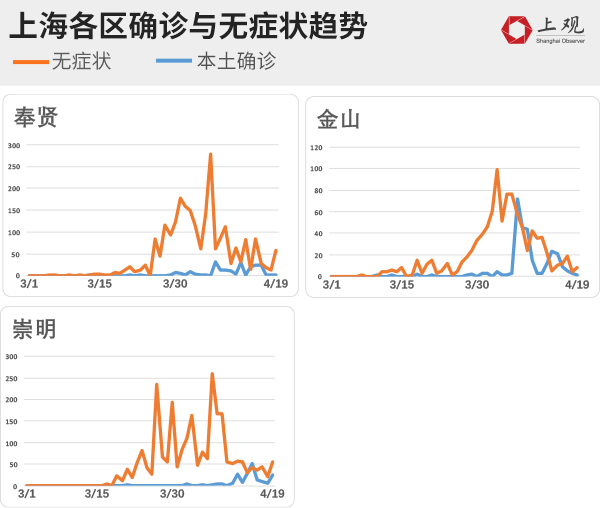 4月3日,金山區單日新增無癥狀感染者達到峰值,單日新增99人。而4月7日,單日新增確診病例數也創新高,為72人。但在此之后,金山區新增病例總數不斷下降,在4月19日,單日新增病例總數僅為9人。