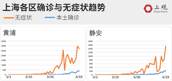 黃浦區單日新增確診人數在4月13日突破200人,4月19日創新高,有368人確診;無癥狀感染者數量則在4月18日達到新峰值,為2961人。