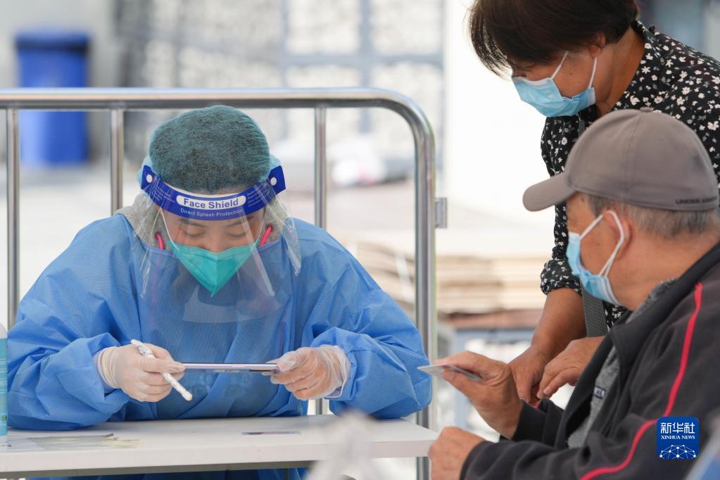 5月5日,在北京市東城區龍潭街道一處核酸檢測點,志愿者為市民登記身份信息。新華社記者 鞠煥宗 攝