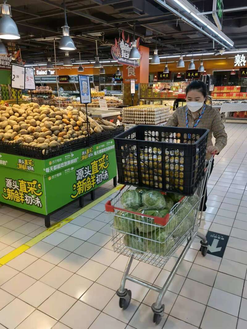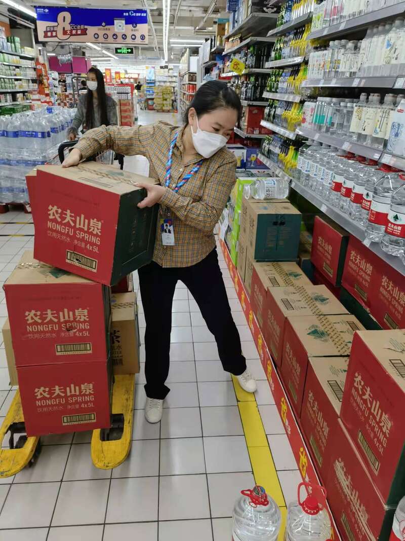 杜娟還記得,4月24號晚,收到管控消息,周圍的小區居民開始有些恐慌,當晚的客流量達到了平常的五六倍,正常營業時間從晚上九點半推遲了一小時,賣場比過年還“熱鬧”。她緊急和采購部溝通,將配貨量提至5倍。