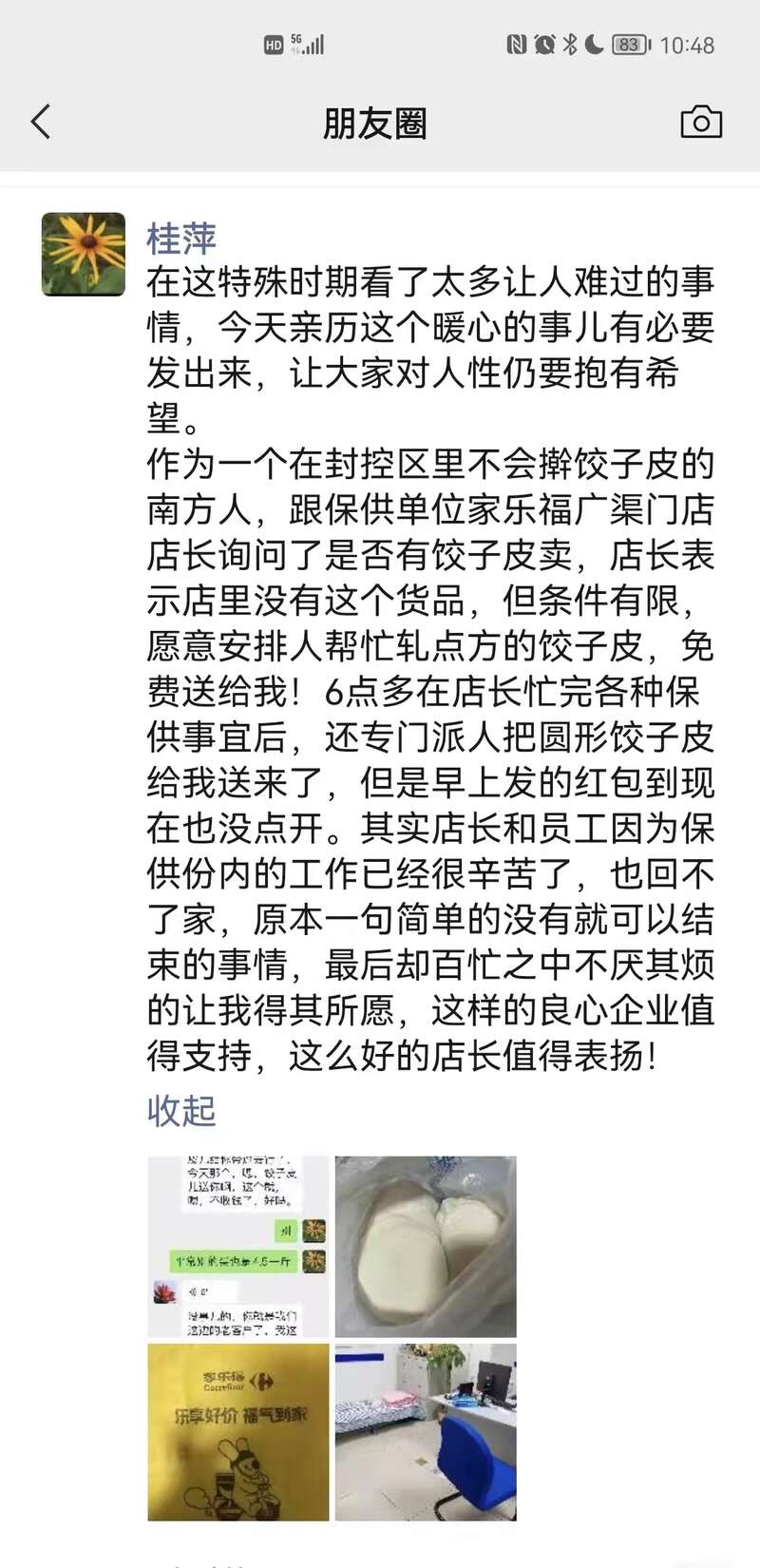 需要餃子皮的封控居民發朋友圈,給杜娟點贊。(受訪者供圖)