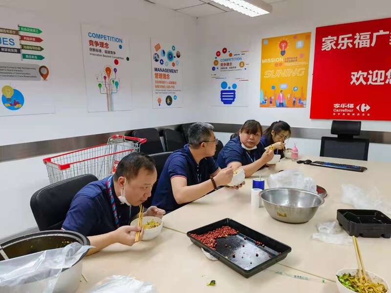 店員們一起吃杜娟做的炸醬面。(受訪者供圖)