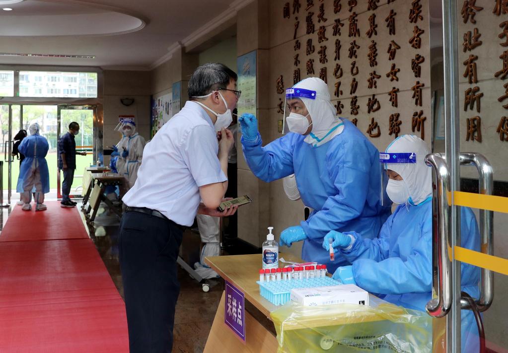 6月5日,上海市大同中學的教師職工在進行每日核酸采樣實操演練。 新華社記者 劉穎 攝