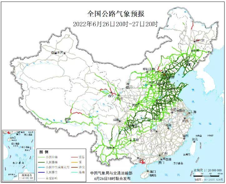 交通運(yùn)輸部出行提示:6月26日20時(shí)至27日20時(shí),四川盆地東部和南部、重慶大部、陜西東南部、湖北西部、河南中東部、山東、蘇皖北部、北京、天津、河北中東部、遼寧、吉林東南部、內(nèi)蒙古東南部等地有大到暴雨,其中,四川盆地東北部、重慶西部和北部、山東中部、河南東部、遼寧東部等地的部分地區(qū)有大暴雨。另外,黑龍江北部和南部、河北西北部、青海東北部、西藏北部、廣西東南部局地有霧。