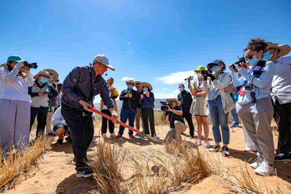 中外媒體記者在中衛(wèi)市沙坡頭治沙區(qū)探尋“麥草方格”的治沙秘密。寧夏新聞網(wǎng)記者 祁瀛濤 攝