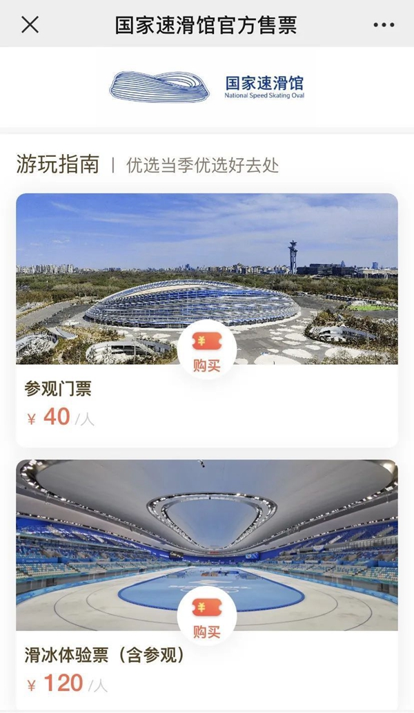 來這里參觀可以通過微信關注“國家速滑館”公眾號進行票務預約。參觀門票40元每人次。參觀加上冰的套票120元每人次。根據游客需求,也可以現場購買80元每人次的滑冰體驗票,其中包含了90分鐘的滑冰體驗和一套冰鞋一套護具。