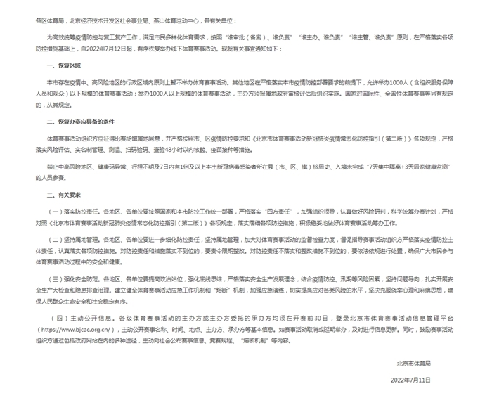 為高效統籌疫情防控與復工復產工作,滿足市民多樣化體育需求,按照“誰審批(備案)、誰負責”“誰主辦、誰負責”“誰主管、誰負責”原則,在嚴格落實各項防控措施基礎上,自2022年7月12日起,有序恢復舉辦線下體育賽事活動。現就有關事宜通知如下: