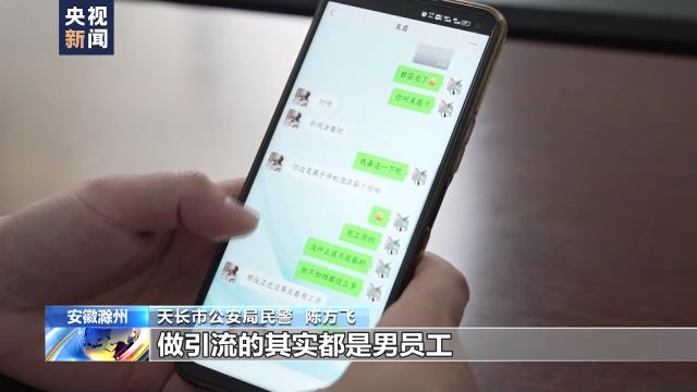 安徽省天長市公安局民警 陳方飛:他們這個犯罪團伙里面有個崗位叫“引流”,做“引流”的其實都是男員工,在他們內(nèi)部也叫“運營”。他們利用女主播的頭像去注冊社交賬號,也會發(fā)一些女主播的日常生活視頻在這個賬號上,然后在各個社交平臺上物色男性客戶,主動去搭訕,吸引他們的關注。