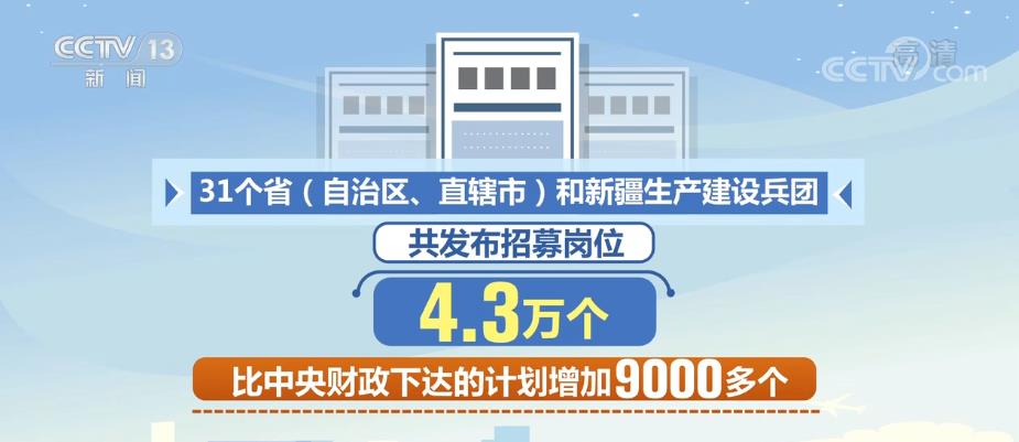 2022年高校畢業生“三支一扶”計劃招募工作已基本完成,31個省(自治區、直轄市)和新疆生產建設兵團共發布招募崗位4.3萬個,比中央財政下達的計劃增加9000多個。