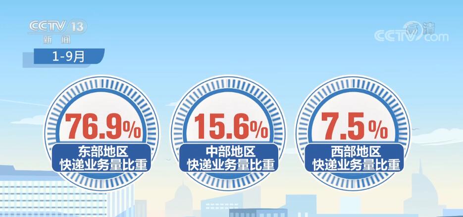 國家郵政局數(shù)據(jù)顯示,1—9月,東、中、西部地區(qū)快遞業(yè)務(wù)量比重分別為76.9%、15.6%和7.5%。與去年同期相比,東部地區(qū)快遞業(yè)務(wù)量比重下降1.4個百分點;中部地區(qū)快遞業(yè)務(wù)量比重上升1.3個百分點;西部地區(qū)快遞業(yè)務(wù)量比重上升0.1個百分點。