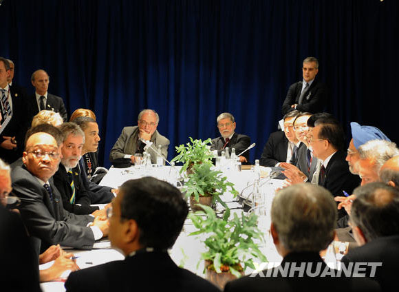 12月18日,國務(wù)院總理溫家寶在哥本哈根與巴西總統(tǒng)盧拉、南非總統(tǒng)祖馬、印度總理辛格“基礎(chǔ)四國”領(lǐng)導(dǎo)人一起與美國總統(tǒng)奧巴馬就聯(lián)合國氣候變化大會達(dá)成最后協(xié)議進(jìn)行磋商。新華社記者劉建生攝