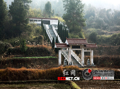 1月26日中午,瀟湘晨報滾動新聞記者驅車來到衡陽市衡南縣硫市鎮太陽村大樹組,隔著一片水田的鄉道對面,很容易就發現了網帖中的那個“豪華墓地”,如果在遠處眺望,還會以為這是個建在半山腰上的祠堂,在這個規模跟烈士墓一般大的地方,進門的牌坊頂上是“劉氏陵園”四個大字,和網上照片沒有任何區別。