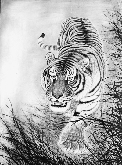農民創作的工筆畫老虎圖。河南省商丘市民權縣王公莊村被稱為“中國畫虎第一村”,當地村民每年春節前都會創作各種各樣的虎畫。沙浪攝