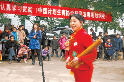 祁東縣靈官鎮計生協會會員賀玉英在演唱由《中國計劃生育協會科學發展規劃綱要》改編而成的漁鼓調詞。何曉曉 攝