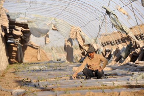 4月24日,恰特卡勒鄉(xiāng)農民提不拉在被大風吹毀的大棚內查看茄苗受損情況。4月23日至24日,新疆吐魯番遭遇大風和沙塵天氣。據吐魯番地委提供的數據,目前42萬多畝農田、1.4萬多座溫室大棚受災,當地還出現因風災導致的火災和建筑物坍塌情況。 新華社記者 江文耀 攝