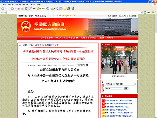 山西省朔州市平魯區(qū)人民政府對(duì)《山西平魯一價(jià)值數(shù)億元企業(yè)以一萬(wàn)元賣給個(gè)人引爭(zhēng)議》報(bào)道的回應(yīng)