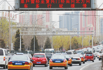 4月12日,北京環線的交通信息提示牌上顯示“車多行駛緩慢”。 新華社記者 李文攝