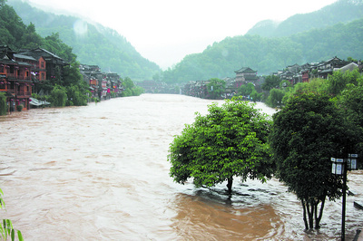 7日23時至8日上午10時,(湖南)鳳凰縣連降大到暴雨,造成大面積受災,沱江沿線部分景點遭水淹。截至8日上午12時,該縣受災人口10.5萬人,全縣直接經濟損失達17195萬元。此次暴雨還導致該縣農作物受災面積達10453公頃,毀壞耕地面積87公頃。截至記者發稿時,鳳凰縣城通往外界的主要生命通道209國道奇梁洞路段被洪水淹沒,汽車無法通行。