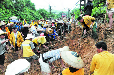 200多名干部群眾正在滬昆鐵路1464+475m段塌方現場奮力搶修。石之光攝(圖片來源:長沙晚報)