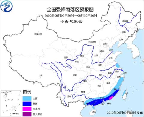 預計,6月9日20時到6月10日20時,江蘇東部、浙江南部、福建大部、廣東大部、廣西中南部、臺灣西北部等地有大雨,其中,福建南部、廣東中南部、廣西東南部等地有暴雨,局部有大暴雨;上述部分地區還將伴有短時雷雨大風等強對流天氣。