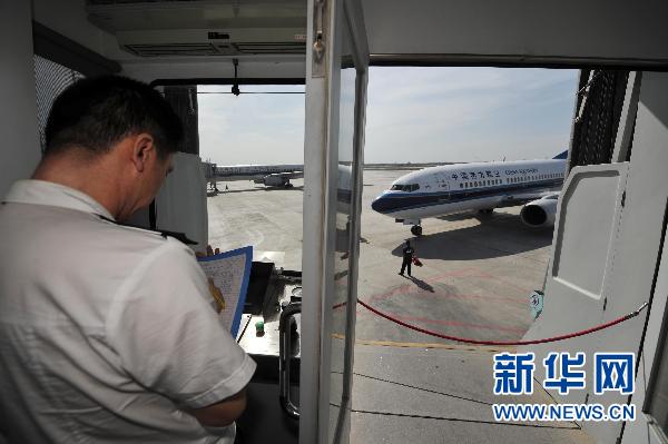 6月16日,工作人員為撤僑包機停靠廊橋做準備。新華社記者趙戈攝