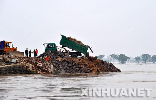 6月25日,推土機在唱凱堤一處決口填沙石。新華社記者章武攝