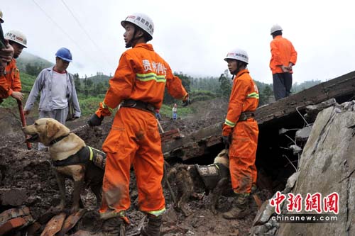 29日,消防官兵在貴州關(guān)嶺山體滑坡現(xiàn)場攜搜救犬在泥濘中工作。