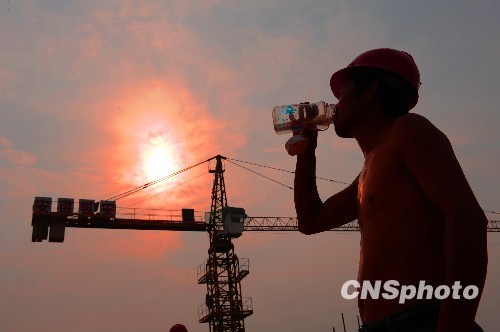 2010年7月7日,安徽亳州市南部新區建設工地,農民工在37℃高溫下緊張施工。當天是二十四節氣中的“小暑”,意味著一年之中最熱的時期來臨。近日亳州市持續出現高溫悶熱天氣,烈日下,建設者們仍然忘我地工作著。 中新社發 張延林 攝