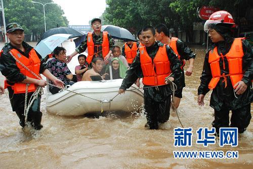 7月13日,安慶市消防支隊官兵在營救被困群眾。當日,安徽安慶市遭受特大暴雨襲擊,城區積水嚴重,大部分道路被淹,目前城區已實行交通管制。當地調集救援官兵600多人、沖鋒舟20多艘展開人員營救,共有1.4萬干部投入抗洪搶險,已轉移群眾2萬多人。新華社發(郭正宏攝)