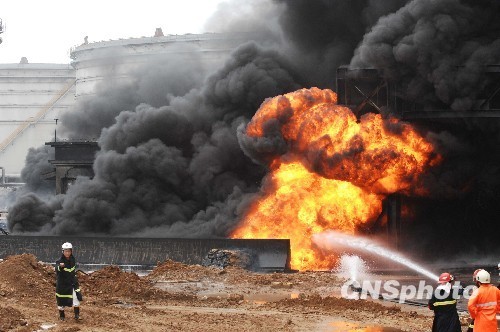 7月17日,消防隊員在火災(zāi)現(xiàn)場撲火。當日10時,大連市政府召開新聞發(fā)布會,宣布大連新港輸油管道爆炸現(xiàn)場儲油罐的所有閥門全部關(guān)閉,火勢基本撲滅,事故未造成人員傷亡。16日18時許,大連新港附近中石油的一條輸油管道發(fā)生爆炸起火。起火管道為直徑900毫米的原油儲罐陸地輸油管線,后引起700毫米管線起火,油罐沒有起火。燃燒產(chǎn)生氣體主要為含硫和芳烴類氣體,無劇毒。 中新社發(fā) 劉德斌 攝