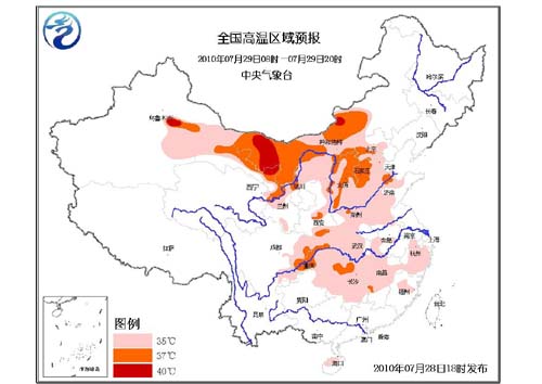 中央氣象臺發布的高溫黃色預警稱:明天(29日)白天,北京、天津、河北大部、山西、陜西關中地區和東部、寧夏中北部、河南大部、山東中西部、安徽北部、湖北、四川盆地東部、重慶、貴州東北部、湖南大部、江西中北部、浙江大部、福建北部、海南北部等地有35℃以上的高溫天氣,局地最高氣溫可達37~38℃;內蒙古中西部、甘肅大部、新疆吐魯番盆地及南疆盆地東部等地將有35~37℃的高溫天氣,局地最高氣溫可達40℃以上。