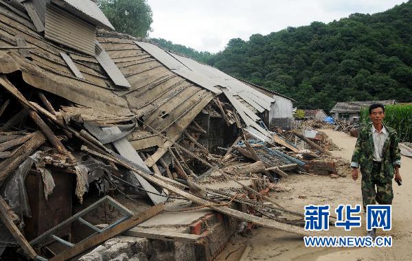 8月3日,樺甸市重災區夾皮溝鎮一名村民從倒塌的房前走過。當日,記者從吉林樺甸市政府了解到,截止到8月3日,該市洪災死亡失蹤人口已經達到48人,近20萬人口受災。洪災中,倒塌民房7677戶,損壞房屋19670間。現在樺甸市常山鎮、二道甸子鎮等重災區正在籌備災后重建。 新華社記者 宗巍 攝