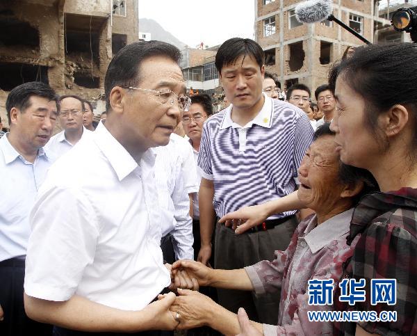 8月9日,中共中央政治局常委、國務院總理溫家寶繼續在甘肅舟曲縣特大山洪泥石流災區察看災情,指導抗洪搶險救災工作。這是溫家寶在舟曲縣災區撫慰失去親人的群眾。新華社記者 李學仁 攝