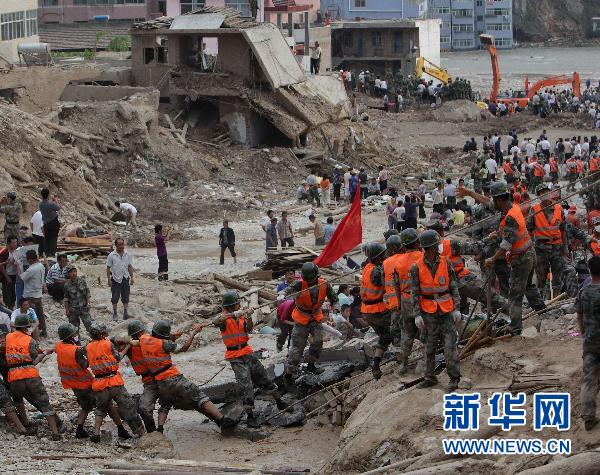 8月9日,救援人員在受災現場開展救援。新華社記者 邢廣利 攝