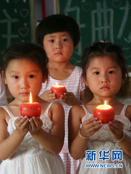8月14日,山東郯城縣新愛嬰幼兒園的孩子們點燃蠟燭,為舟曲災區祈福。新華社發(張春雷 攝)