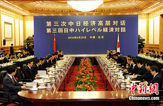 8月28日,第三次中日經(jīng)濟(jì)高層對話在北京人民大會堂舉行。中國國務(wù)院副總理王岐山、日本外相岡田克也等出席。中新社記者 劉震 攝