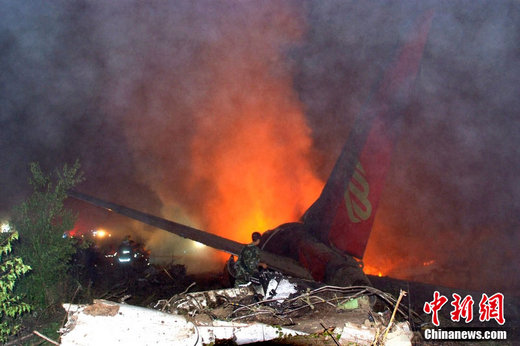 24日21時36分許,河南航空有限公司(原鯤鵬航空公司)一架由哈爾濱飛往伊春的E190型飛機在抵達伊春機場降落時失事,機上包括5名機組人員在內共96人。失事現場發現42具遇難者遺體,其余54人獲救送醫,目前無生命危險。圖為飛機失事現場 。陳剛 攝
