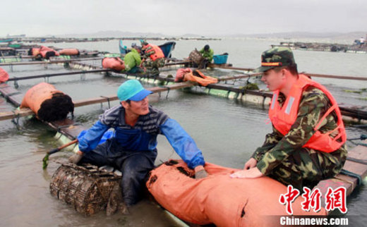 8月31日,福建邊防派出所官兵深入碼頭、漁排、臺輪停泊點,幫助轄區漁船民和來靠臺胞加固船只及漁排,以應對當前海面上“獅子山”、“圓規”和“南川”三個熱帶風暴的夾擊。中新社發 黃煜情 攝