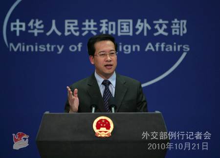 2010年10月21日,外交部發言人馬朝旭主持例行記者會。