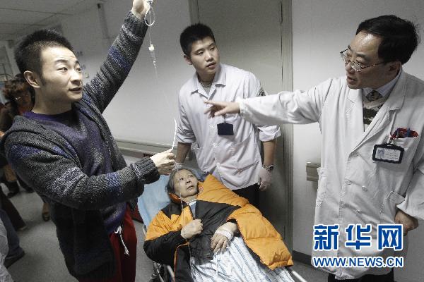 11月15日,靜安區中心醫院的醫護人員正在詢問一名火災傷者的情況。 新華社記者 裴鑫 攝