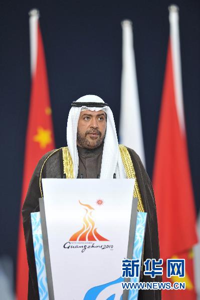 11月27日,亞奧理事會主席艾哈邁德·法赫德·薩巴赫親王在閉幕式上致辭。當日,第16屆亞運會在廣州市海心沙島舉行閉幕式。新華社記者公磊攝