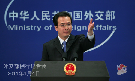2011年1月4日,外交部發言人洪磊主持例行記者會。