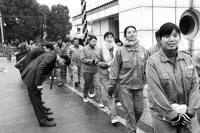今年1月3日,浙江省臺(tái)州市一家企業(yè)新年第一個(gè)工作日,董事長(zhǎng)攜公司中高層領(lǐng)導(dǎo)在大門(mén)口鞠躬迎接員工上班。孫金標(biāo)攝(資料圖片)