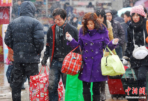 資料圖:江西九江火車站、南昌火車站看到,旅客提著笨重的行李,冒著風雪踏上回家的旅途。